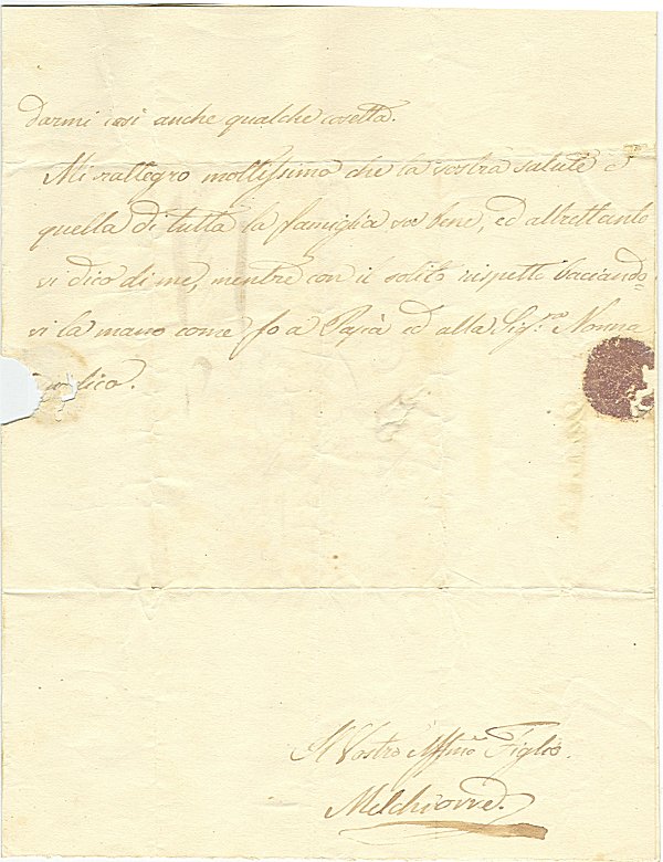 rispetto baciandovi la mano come fo a Papà ed alla Sig. ra Nonna [supp]lico